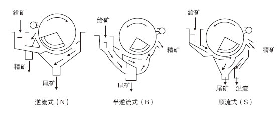 CTS、CTN、CTB系列永磁筒式磁選機磁場分旋轉式、固定式兩種機構,固定式主要適用于弱磁場濕式選別細顆粒的強磁性物質,或者除去非磁性礦物中的強磁性礦物,當漿流入磁場區時,其中強磁性礦物被吸附在圓筒表面,弱磁性和非磁性礦物被分選后排除,而吸附在圓筒表面的強磁性礦物隨圓筒的旋轉被帶出磁場區。旋轉式適用于細粒強(中強)磁性礦物的干選,由于高速旋轉的作用,使磁性顆粒的磁滾翻次數大大高于普通磁選機,這對于破環磁團聚,提高富礦比具有顯著的效果,礦物經分選后被分離成磁性物和非磁性物兩種,分別從各自的排礦口排出該機,適用于礦石粒度為0.6-6mm的粗選和精選。 同一圓筒可配三種槽體,即順流槽(CTS)選別粒度≤6mm,逆流糟(CTN)選別粒度≤0.6mm,半逆流槽(CTB)選別粒度≤1mm。