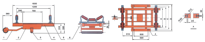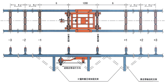 說明:1、測速車及測速傳感器 2、稱重架 3、輔助輥 4、稱重橋 5、原輸送機(jī)托輥改制的計量托輥 5、輸送機(jī)框架