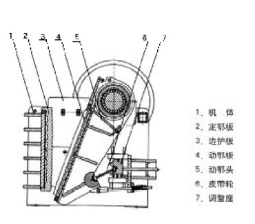 該系列破碎機(jī)工作方式為曲動(dòng)擠壓型,其工作原理是:電動(dòng)機(jī)驅(qū)動(dòng)皮帶和皮帶輪,通過(guò)偏心軸使動(dòng)顎上下運(yùn)動(dòng),當(dāng)動(dòng)顎上升時(shí)肘板與動(dòng)顎間夾角變大,從而推動(dòng)動(dòng)顎板向固定顎板接近,與其同時(shí)物料被壓碎或劈碎,達(dá)到破碎的目的;當(dāng)動(dòng)顎下行時(shí),肘板與動(dòng)顎夾角變小,動(dòng)顎板在拉桿,彈簧的作用下,離開(kāi)固定顎板,此時(shí)已破碎物料從破碎腔下口排出。隨著電動(dòng)機(jī)連續(xù)轉(zhuǎn)動(dòng)而破碎機(jī)動(dòng)顎做周期運(yùn)動(dòng)壓碎和排泄物料,實(shí)現(xiàn)批量生產(chǎn)。